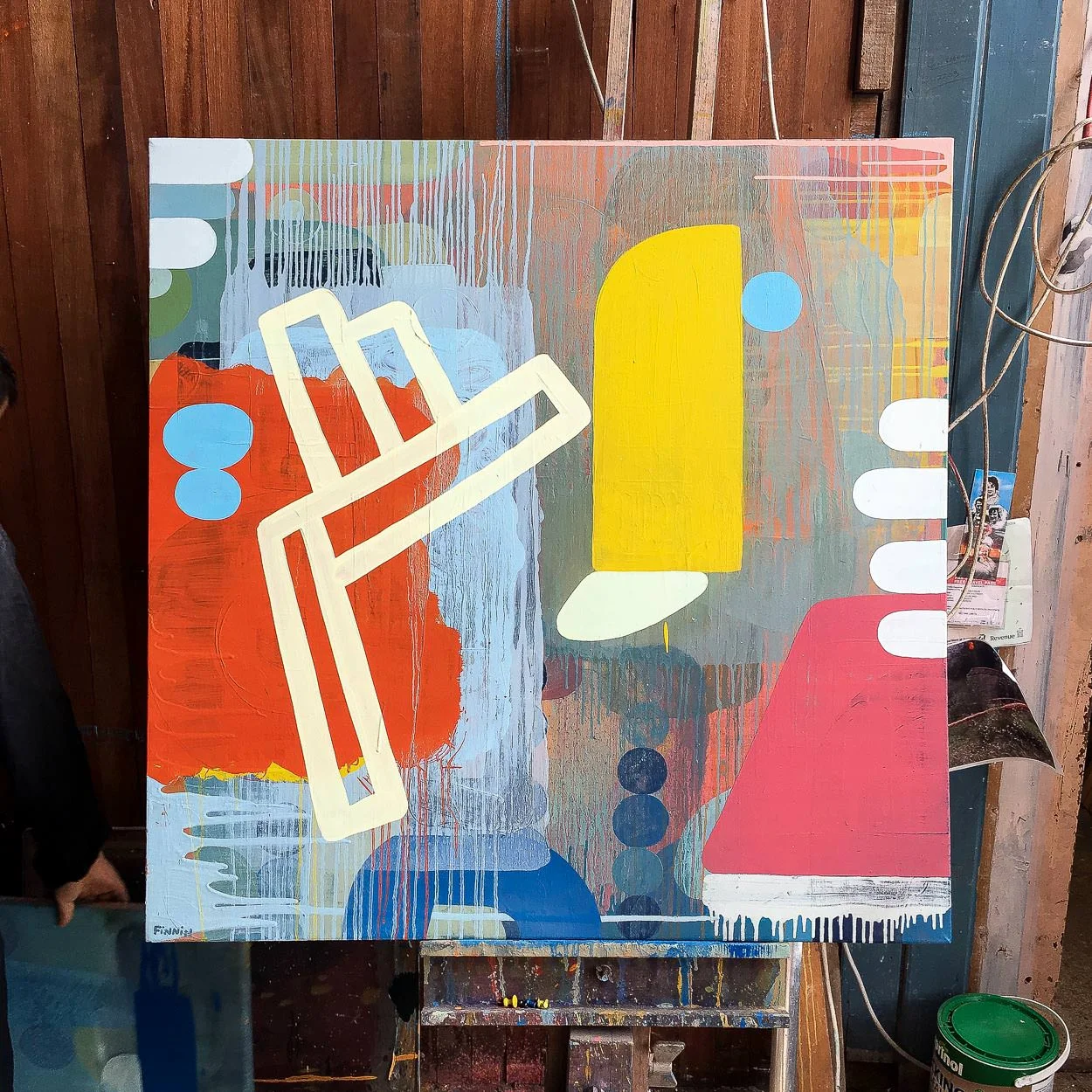 The blue semi-circle on the left came from the two large canvases I was working on at the time. A week or so later I added the blue sculptural shapes, like stress balls stacked on top of each other. The stern vertical green made more sense then.